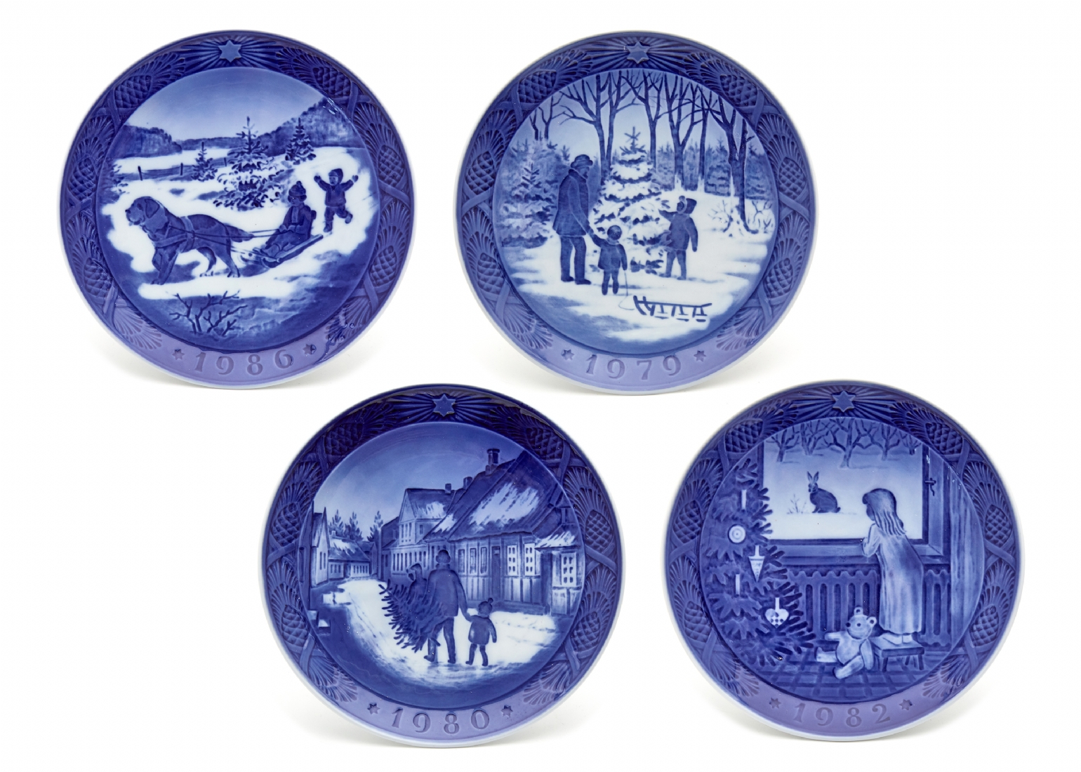 כל צלחת נושאת ציון שנה (1980, 1982, 1986, 1979) כחלק מהסדרה השנתית המבוקשתקוטר: 18 ס"מ