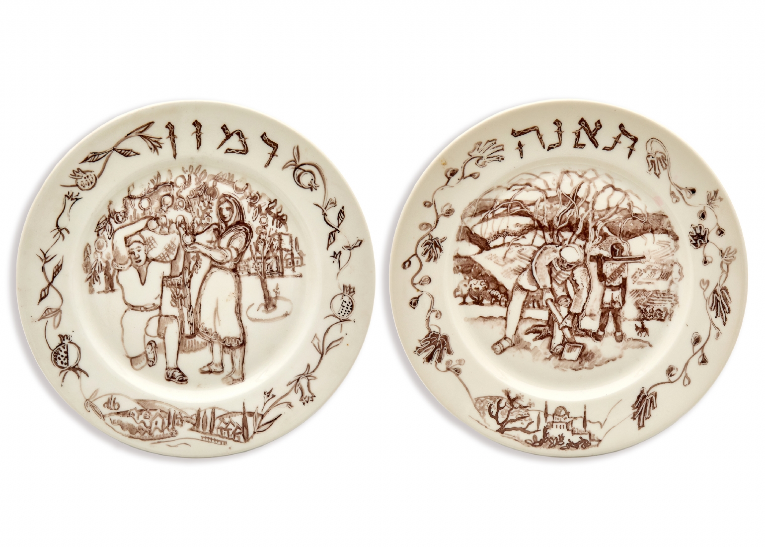 הצלחות מעוטרות בציורי יד המתארים סצנות חקלאיות של מתיישבים בישראל