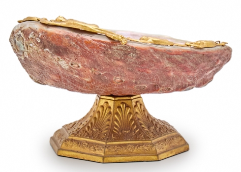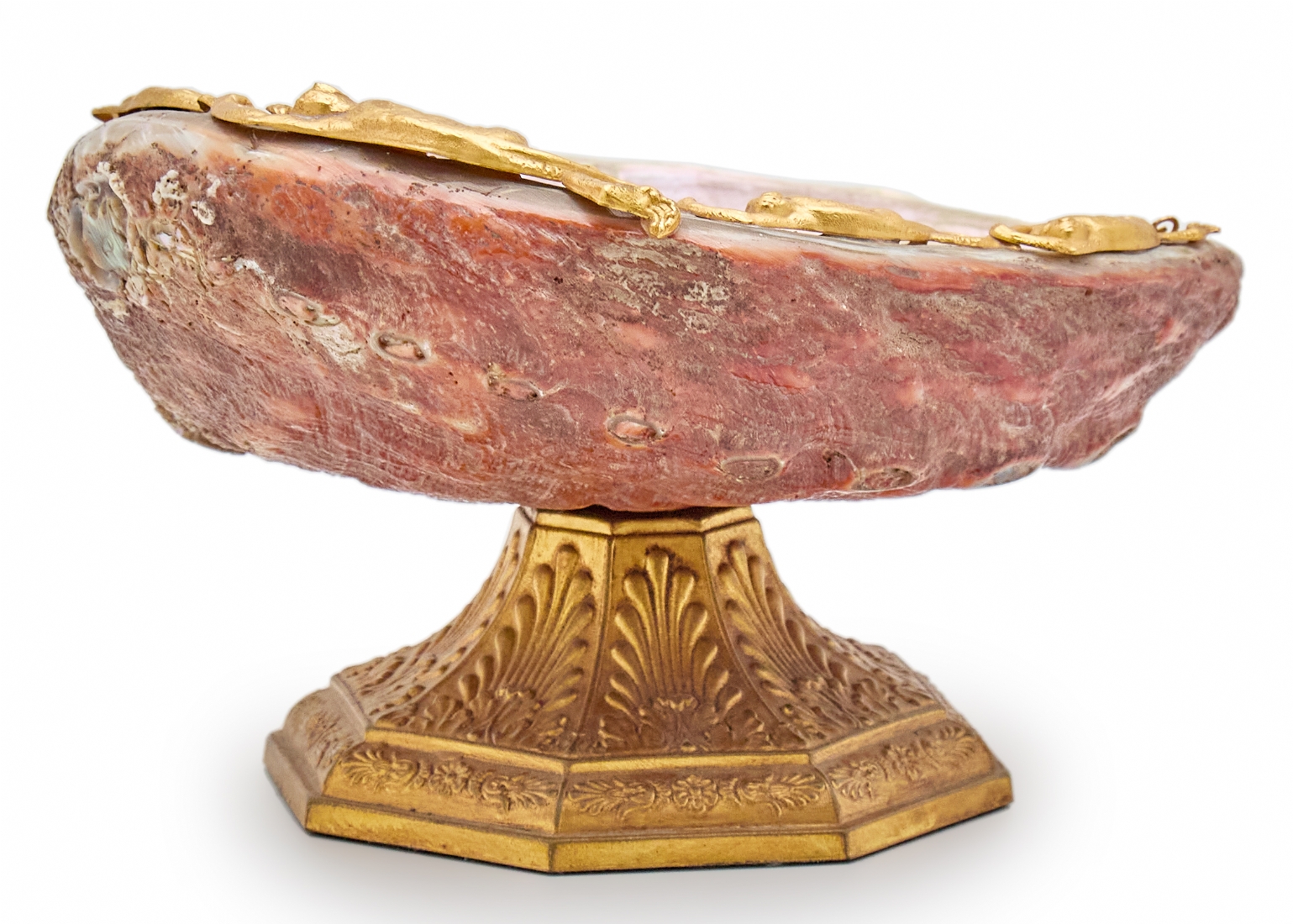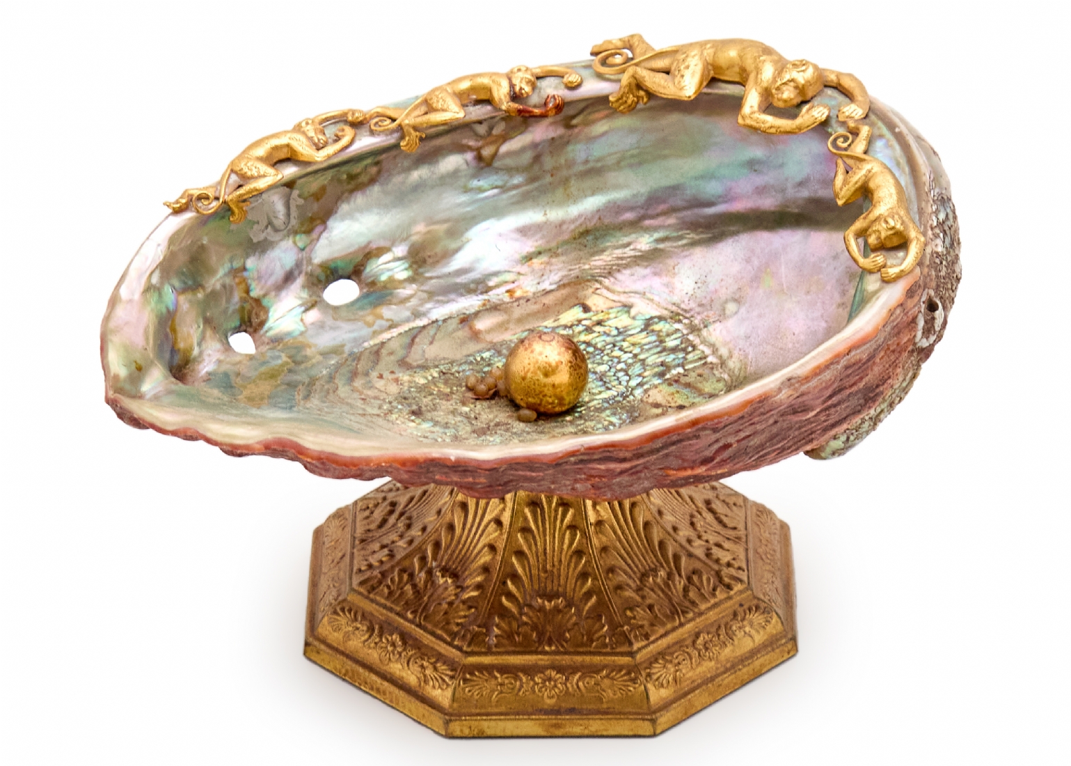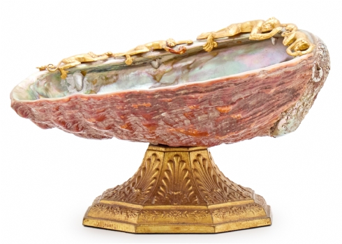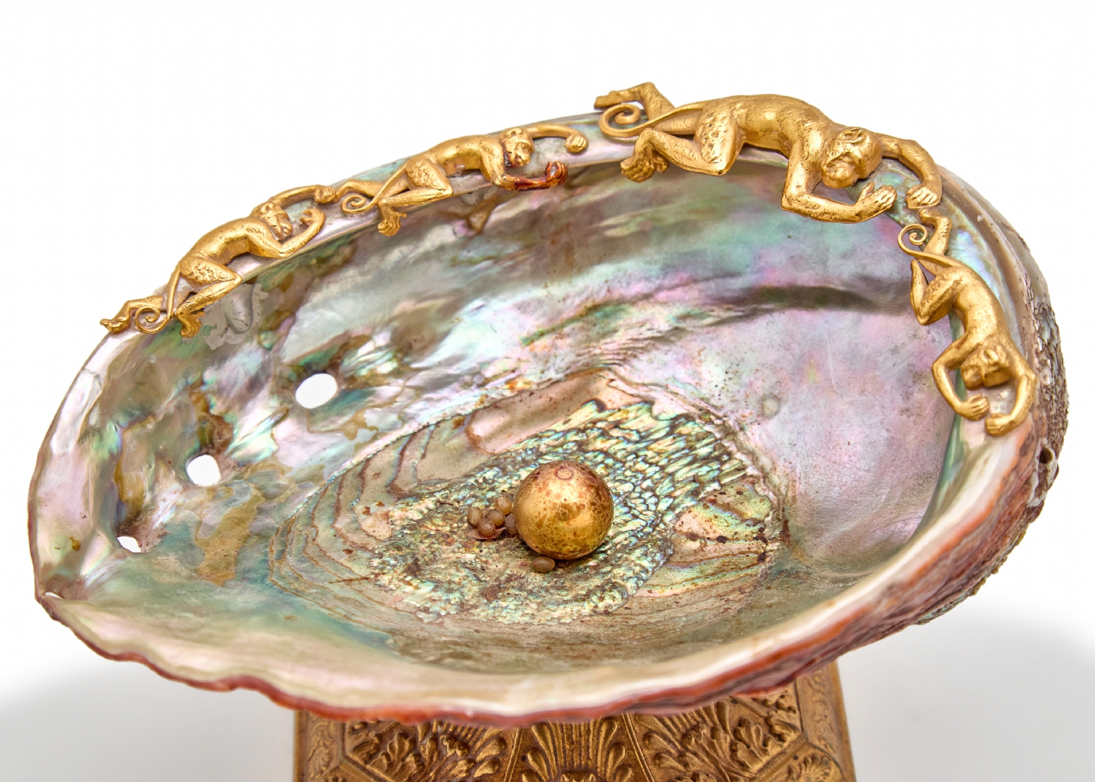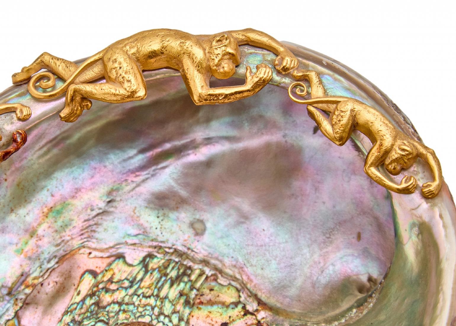 קערת צדף מרשימה על בסיס ברונזה יצוקה עם עיטורי קופים מוזהבים
