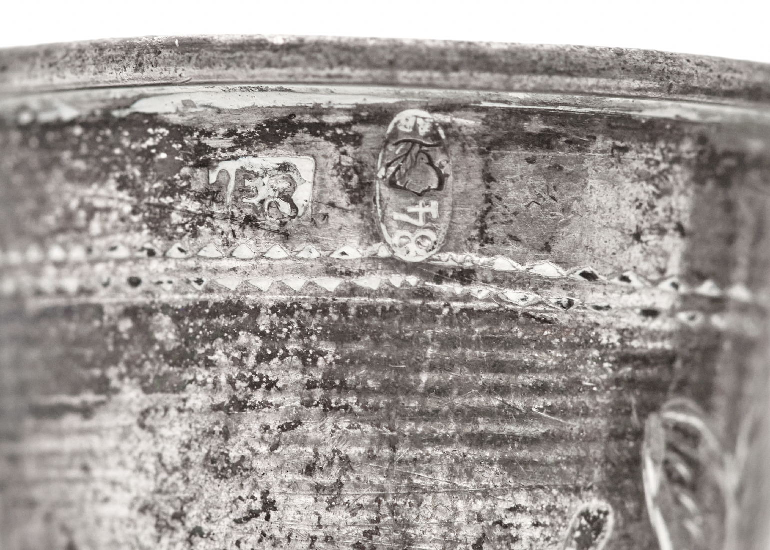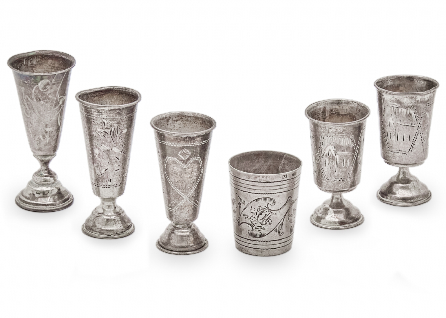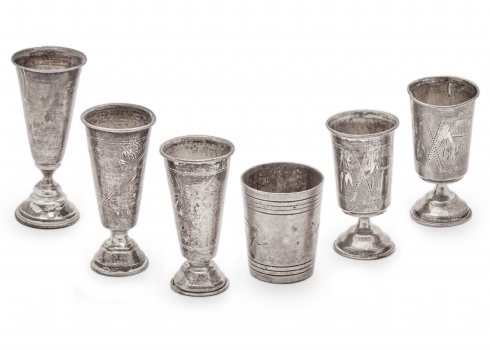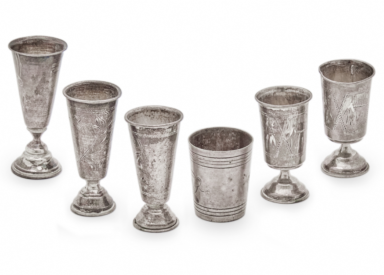שישה גביעים וכוסות כסף רוסים לקידוש, חתומים יצרנים ודגמים שונים