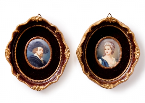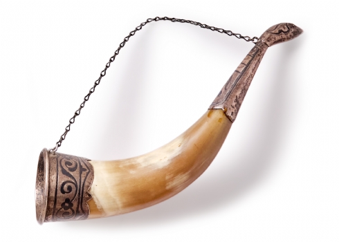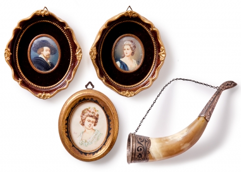 שלוש מיניאטורות פורטרט קלאסיות14X12 ס"מלצדן קרן שתייה גרוזינית מסורתית (Kantsi)אורך: 22.5 ס"מ