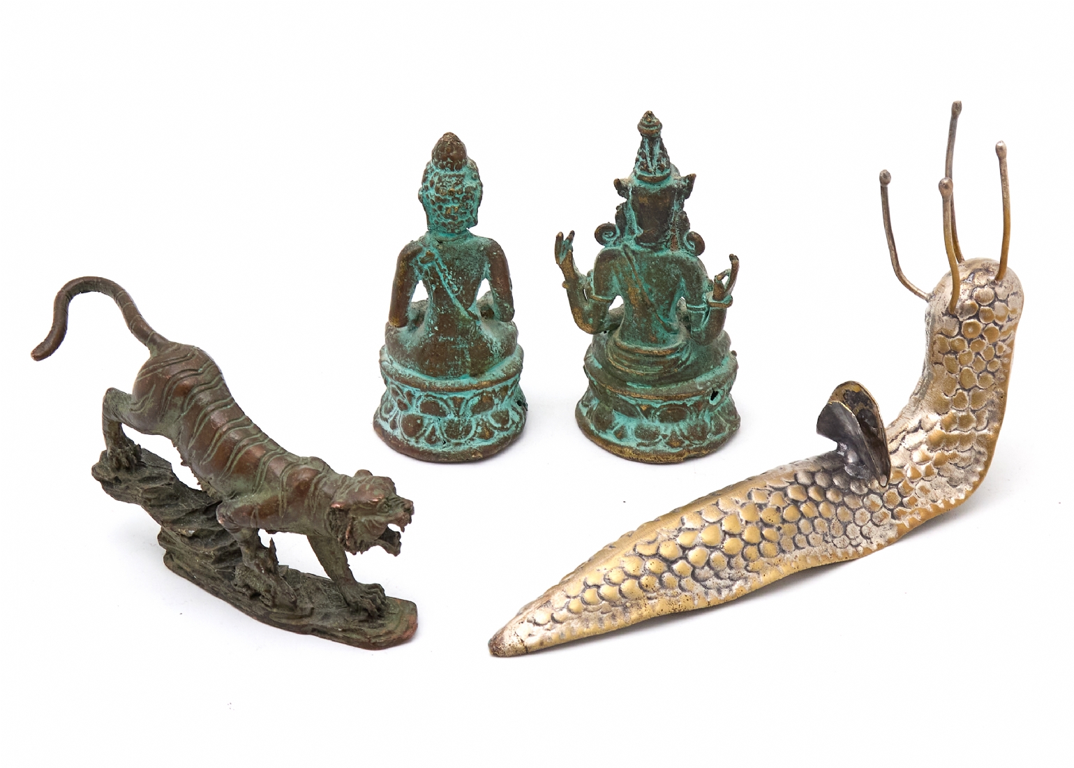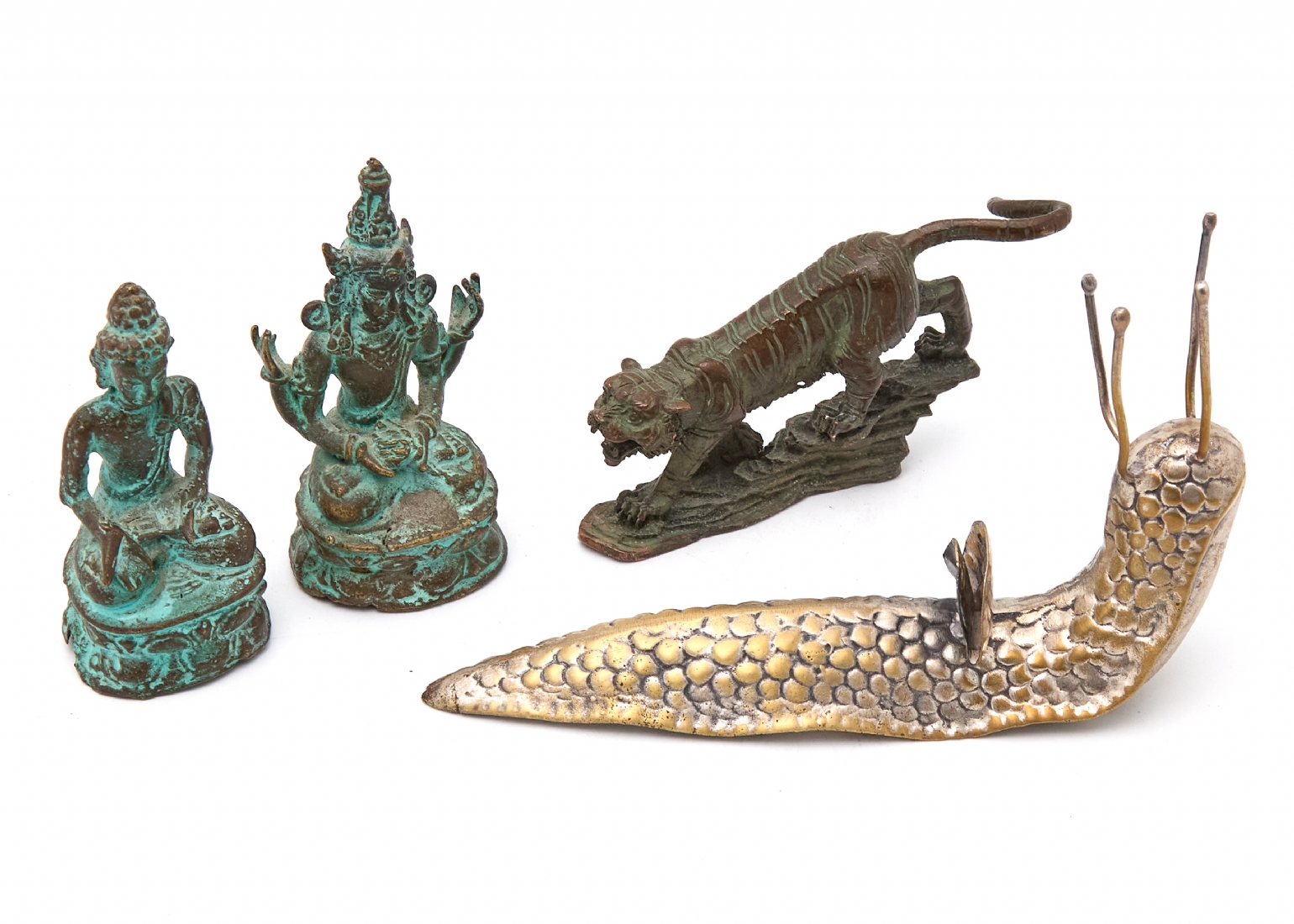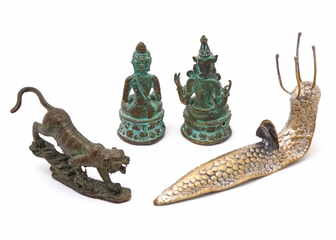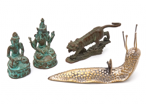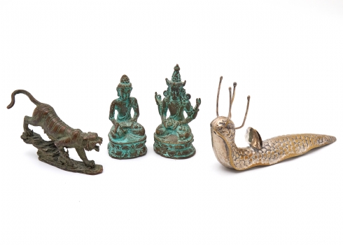 ארבע מיניאטורות דקורטיביות ממתכת ובורנזה - דמויות בודהיסטיות, טיגריס וחילזון