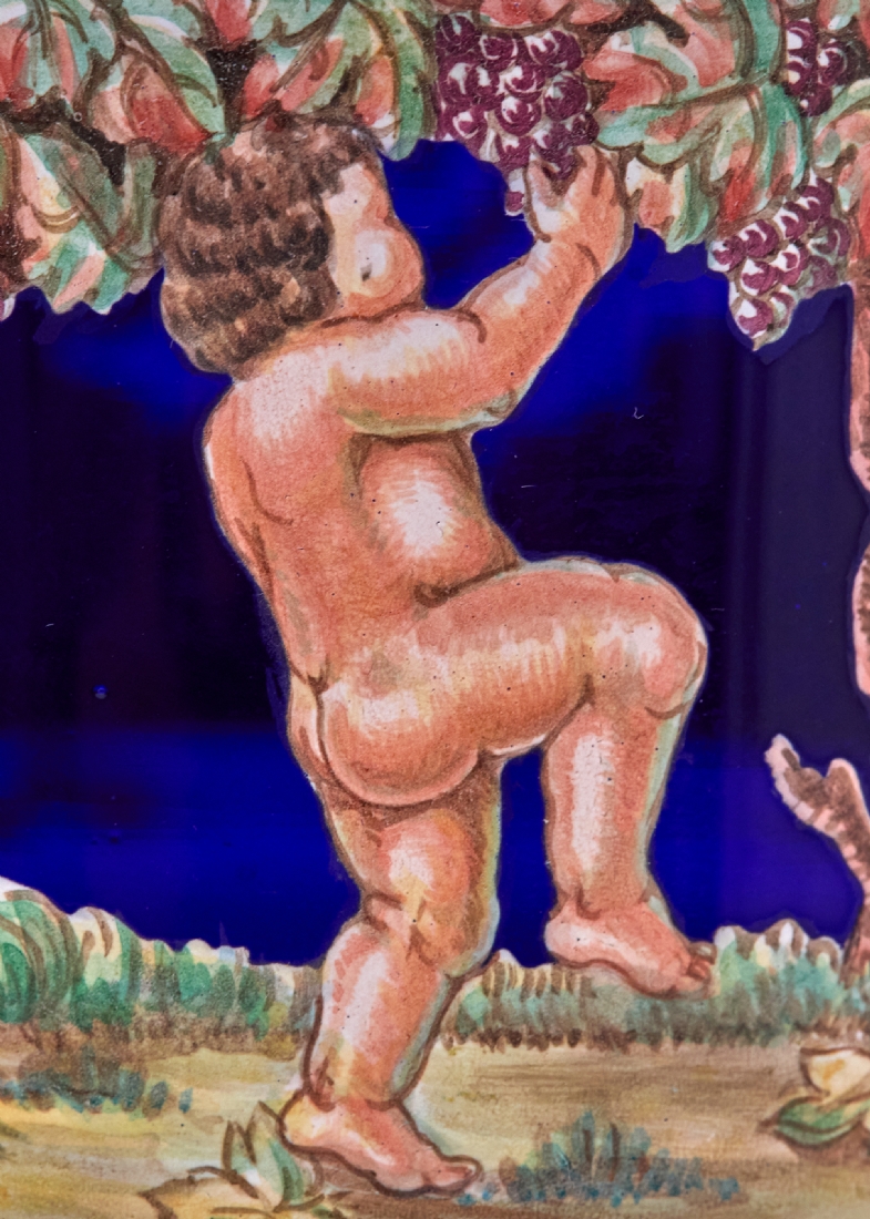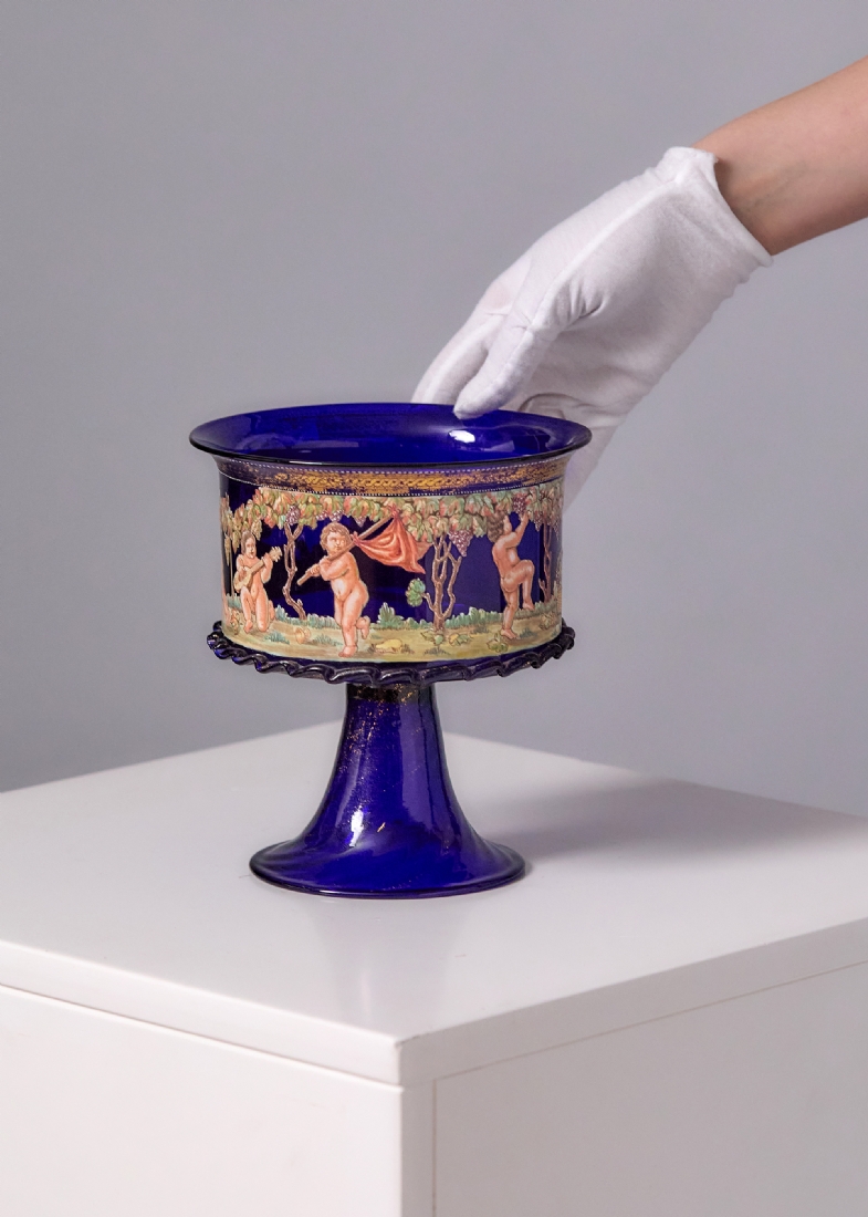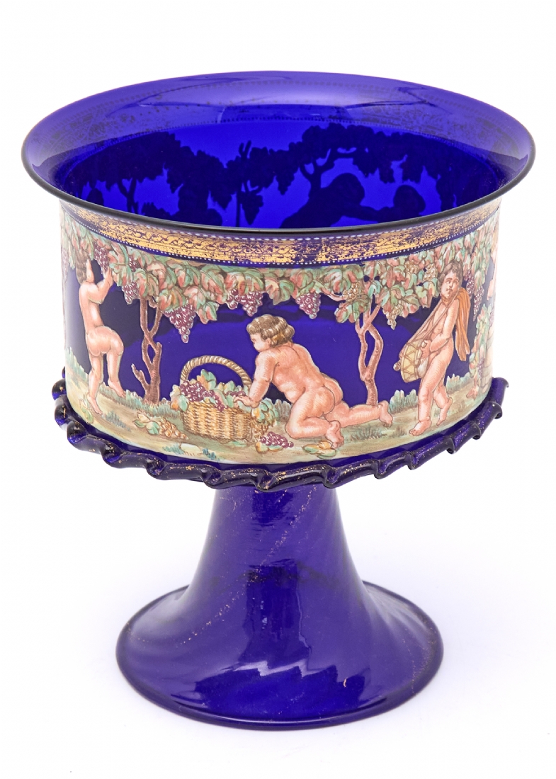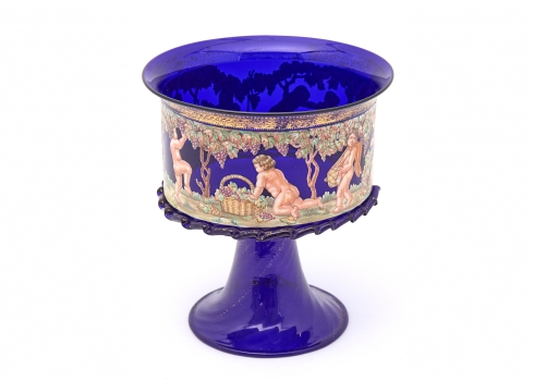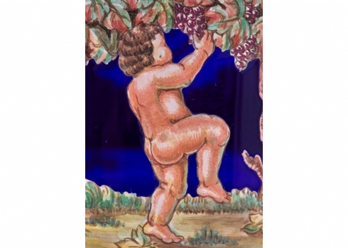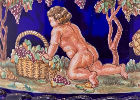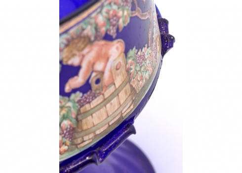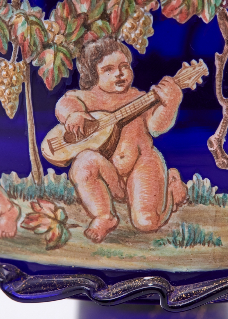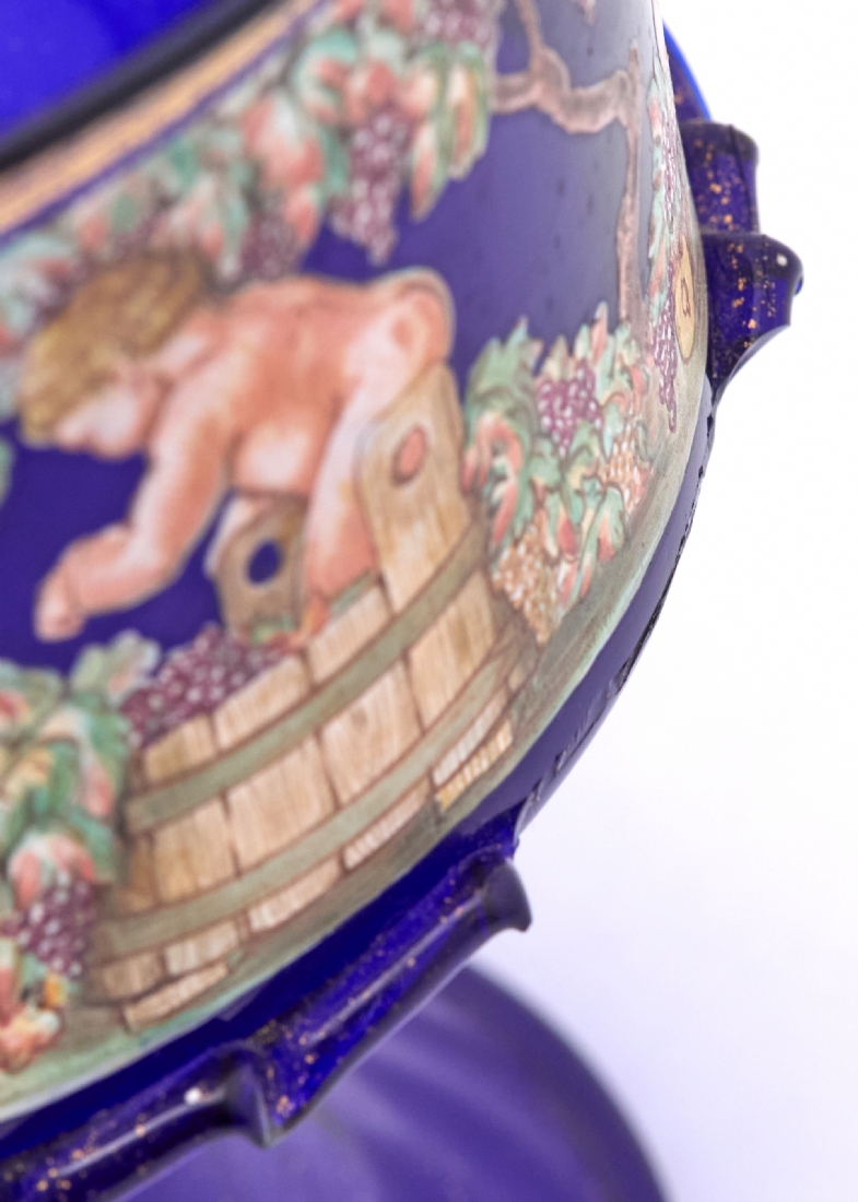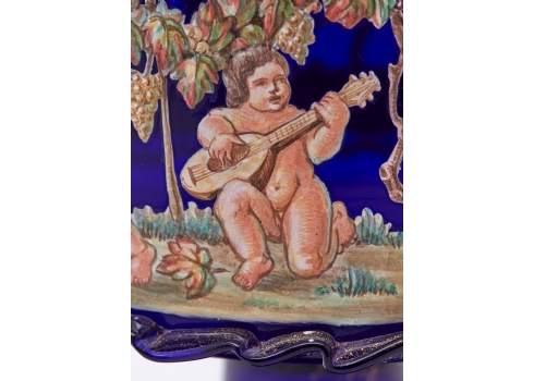 עשוי זכוכית קובלט כחולה (זכוכית ספיר) בעבודת ניפוח יד אמן ומעוטר ציורי יד באמייל המתאר ילדים בוצרים ענבים בכרם, האימרה העליונה מעוטרת זהב, חוסר לעיטור באימרה התחתונה.