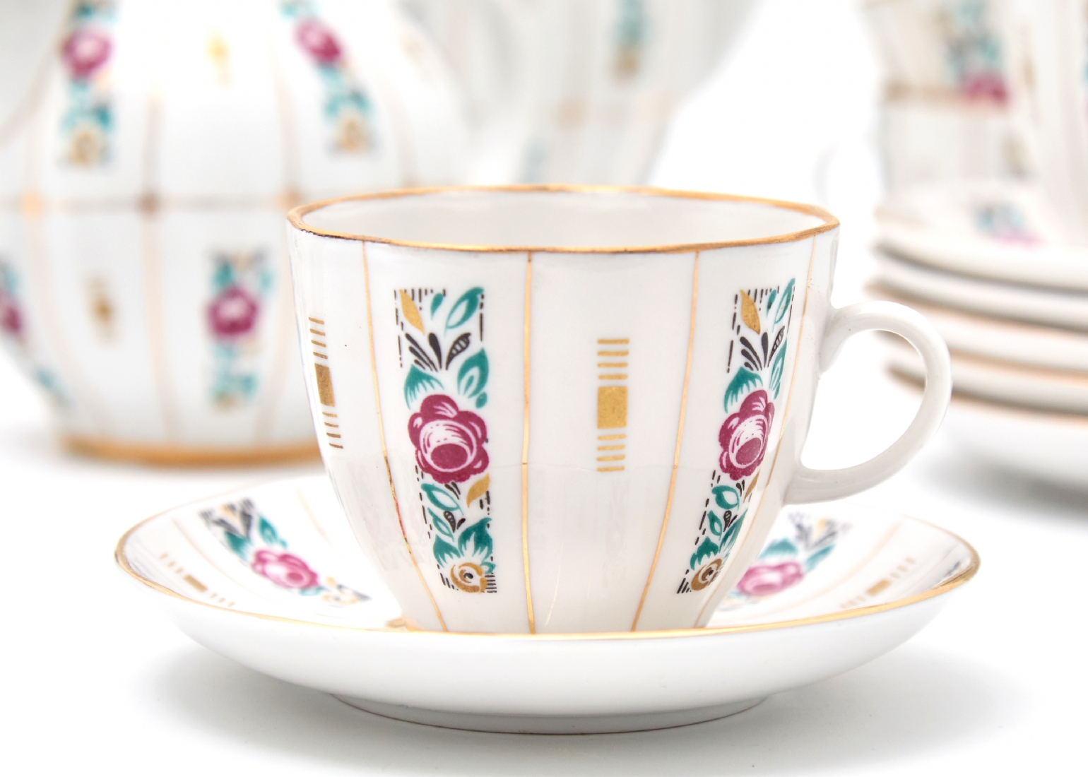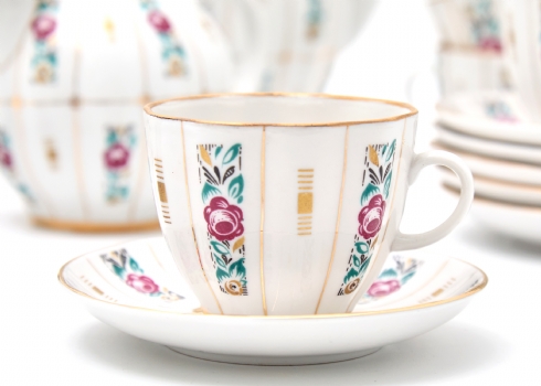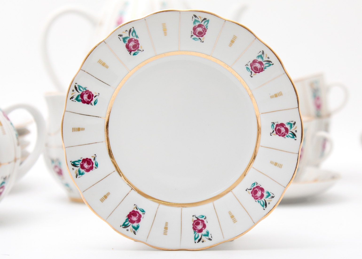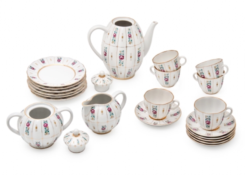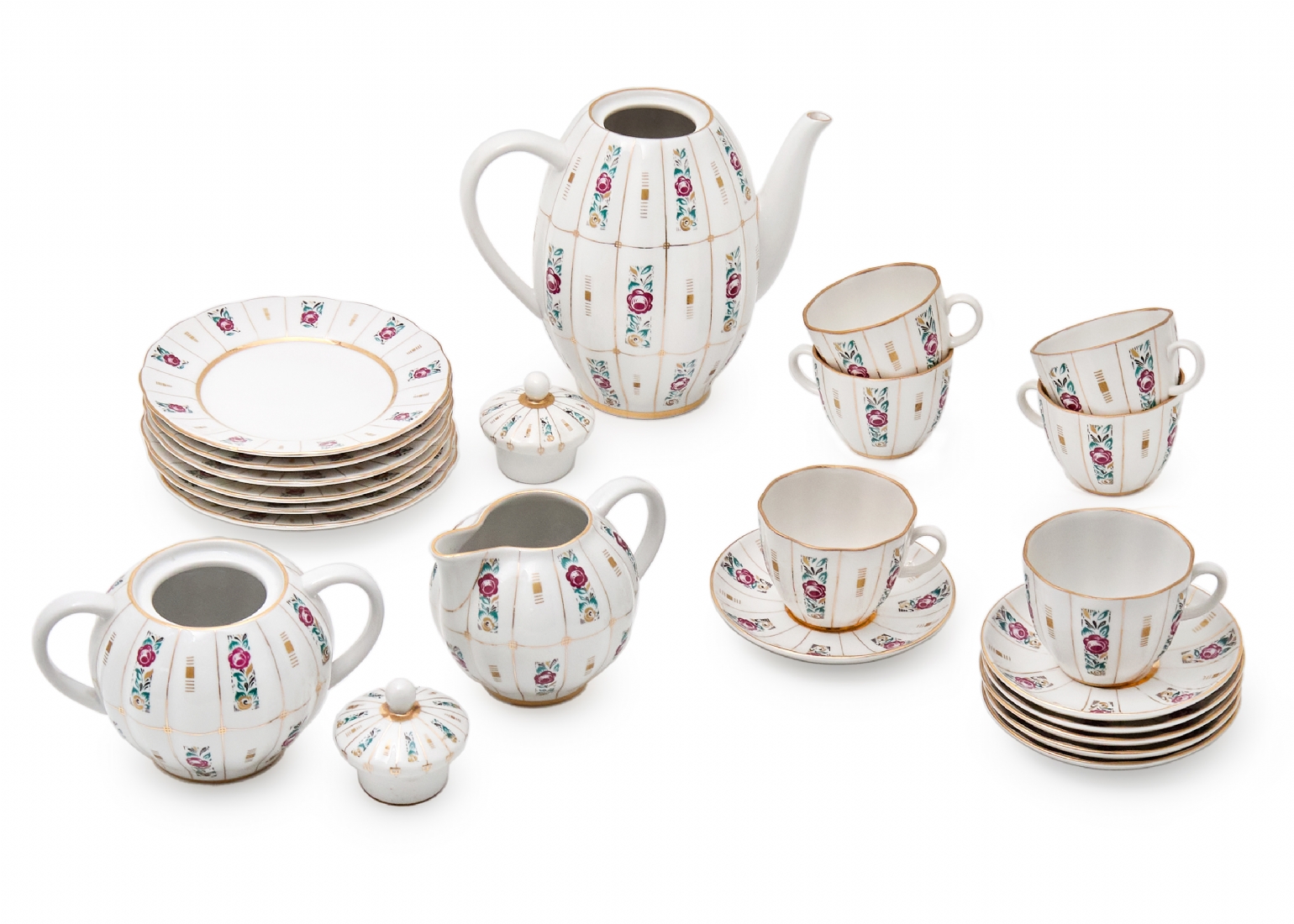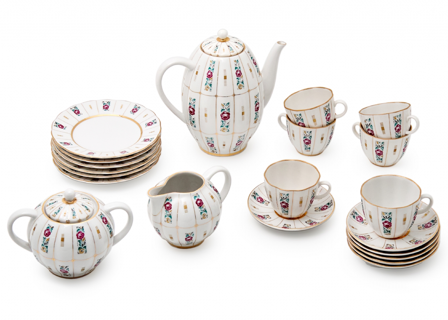 הסט כולל: 6 צלחות : 15 ס"מ6 מלחות 11.5 ס"מקנקן תה בגובה: 19 ס"מכלי סוכר: 15 ס"מכלי חלב: 8 ס"מ6 כוסות: 6 ס"מ