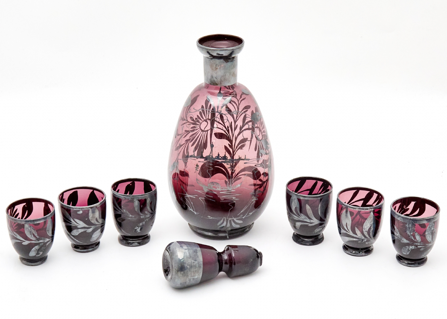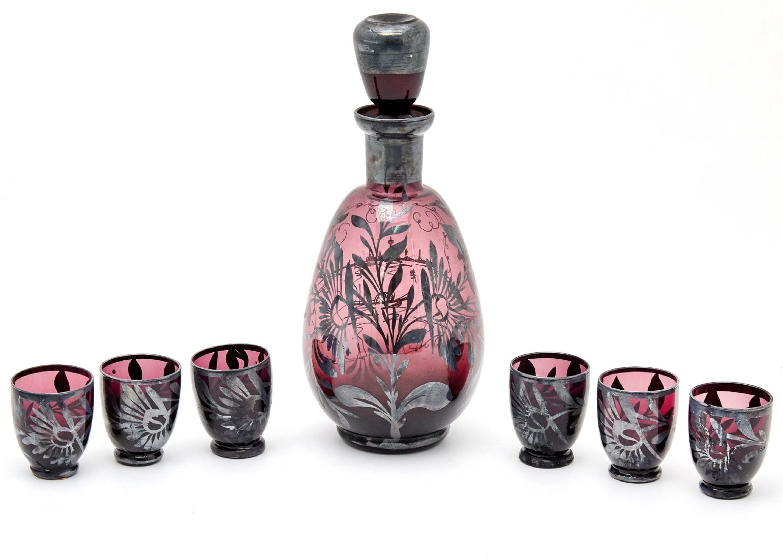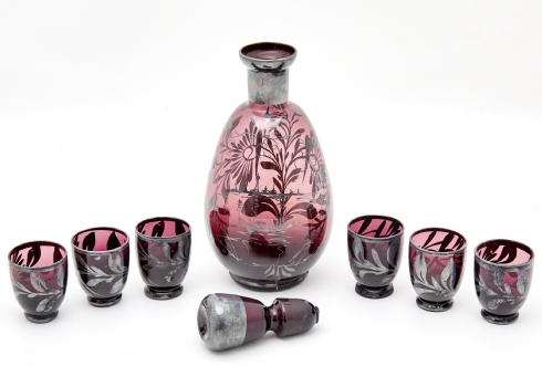 זכוכית בגוון אמטיסט עמוק, מלווה בשש כוסיות תואמותגובה דקנטר: 23 ס"מגובה כוס: 5 ס"מ
