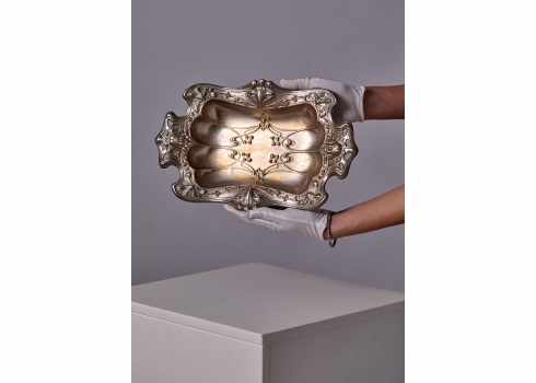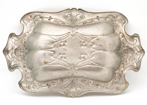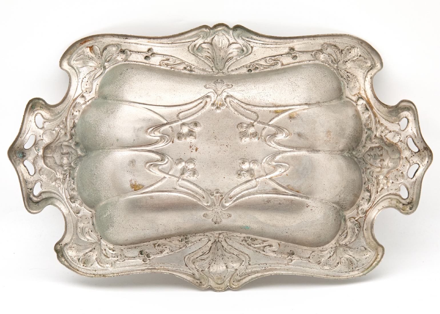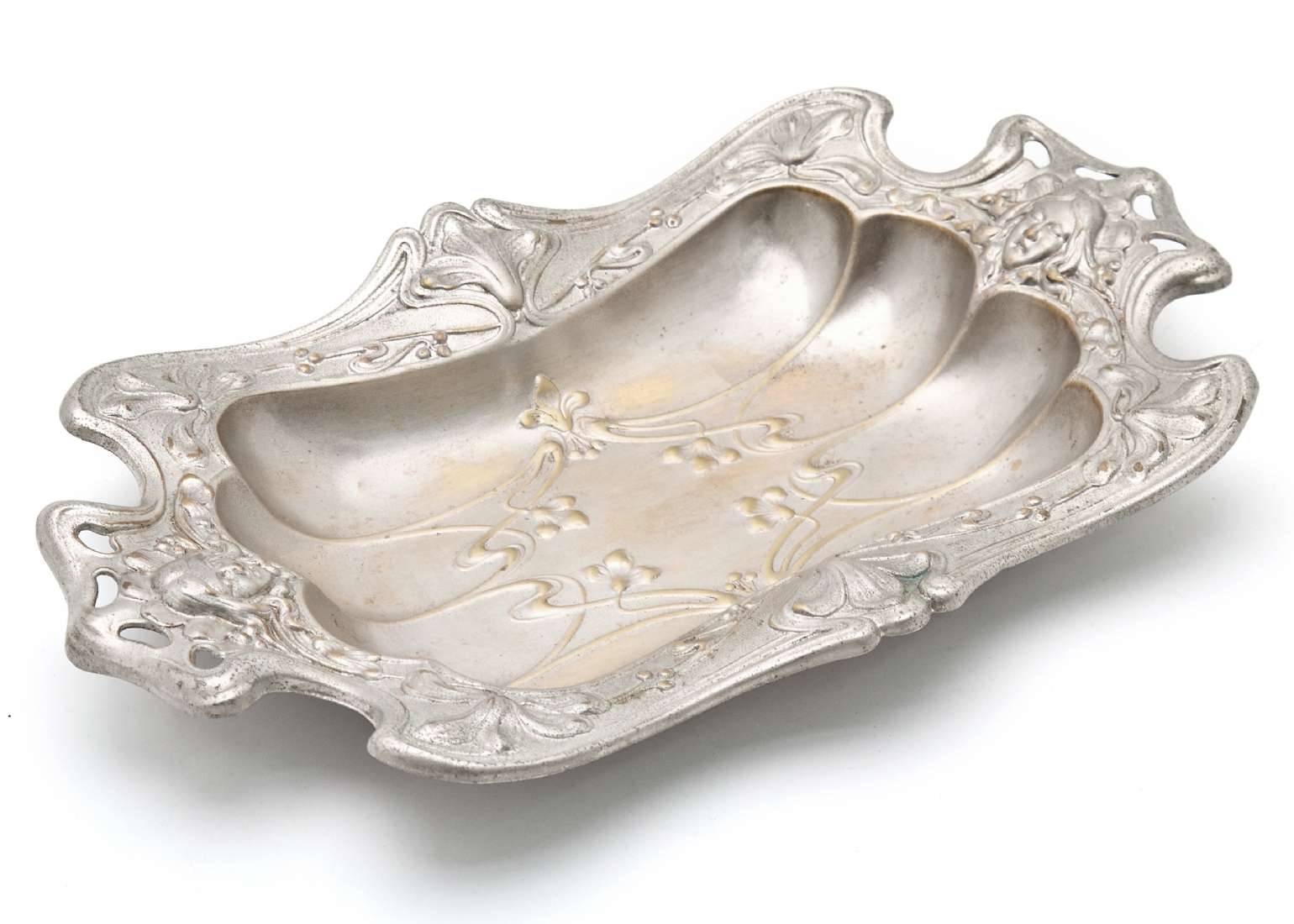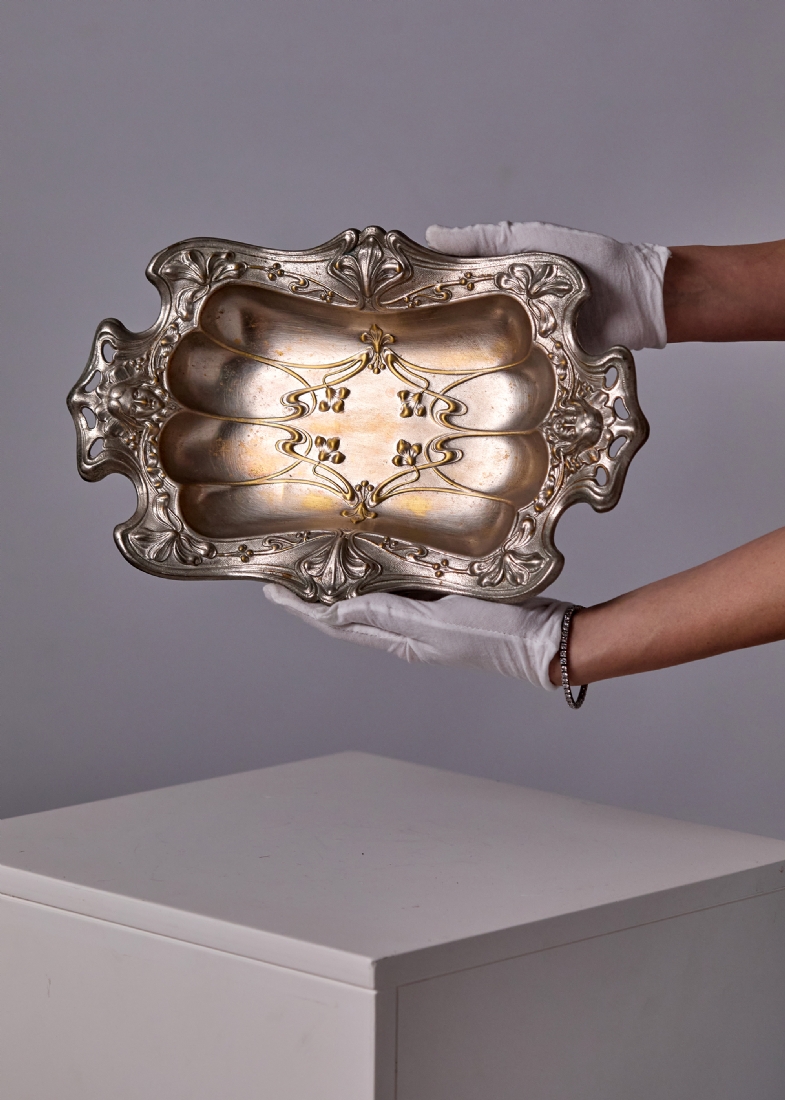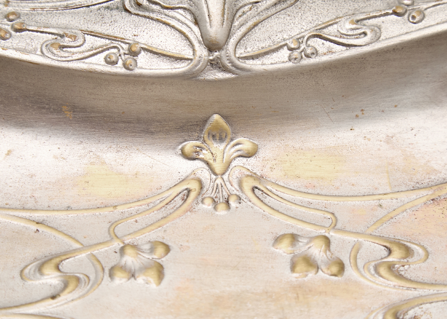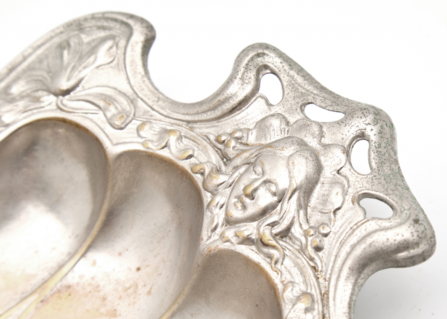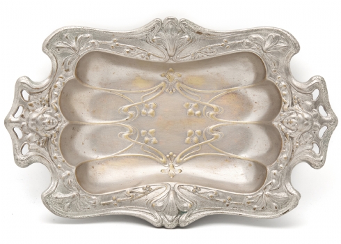 עם מסגרת גלית בדגמי עלים ופרחים ודמות נשית מרכזית בסגנון אופייני לתקופהאורך: 36 ס"מרוחב: 23 ס"מ