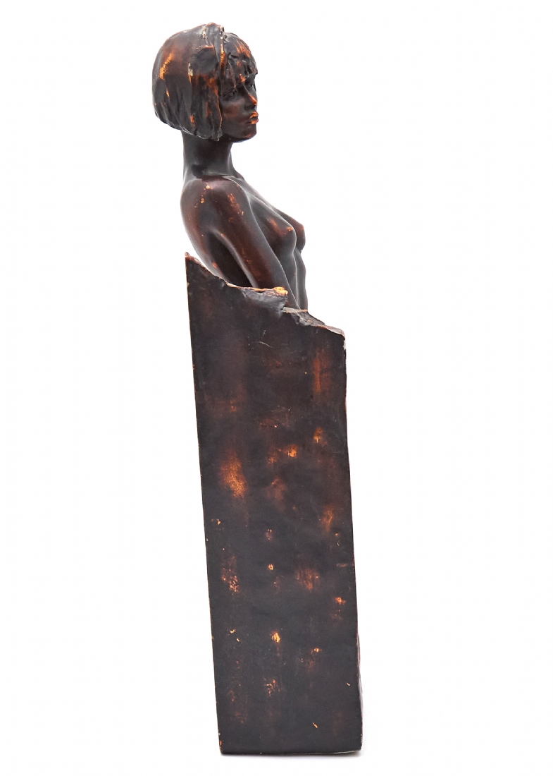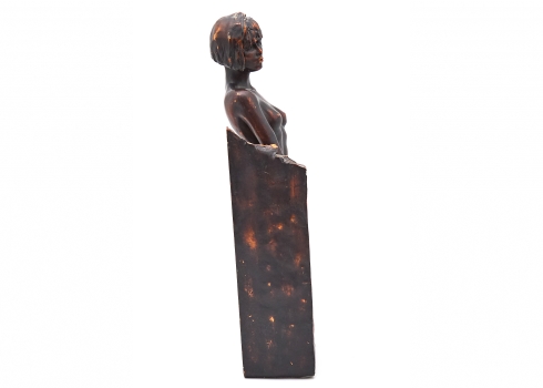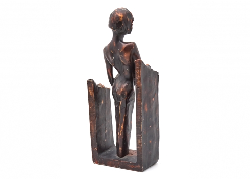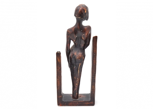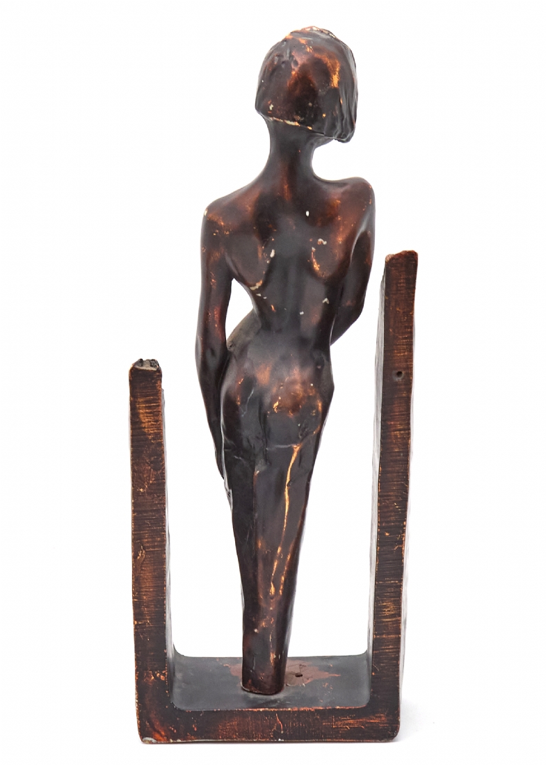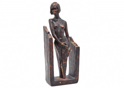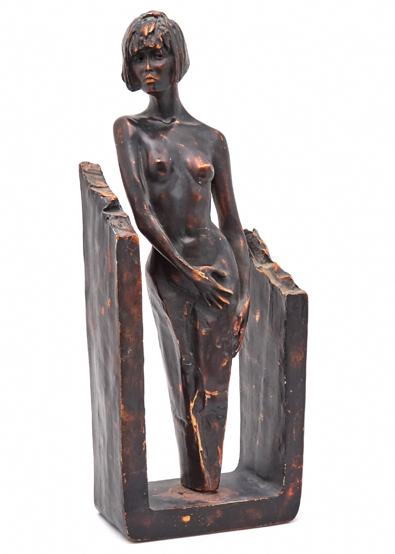 פסל המתאר דמות נשית עומדת בעירום בקומפוזיציה הנתמכת במסגרת בסיס מתכתית