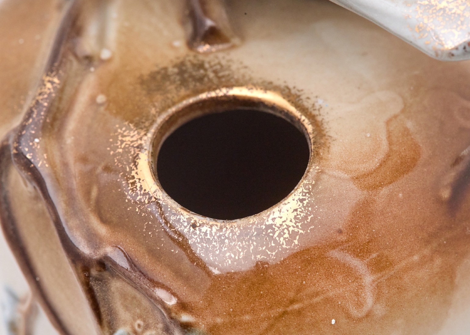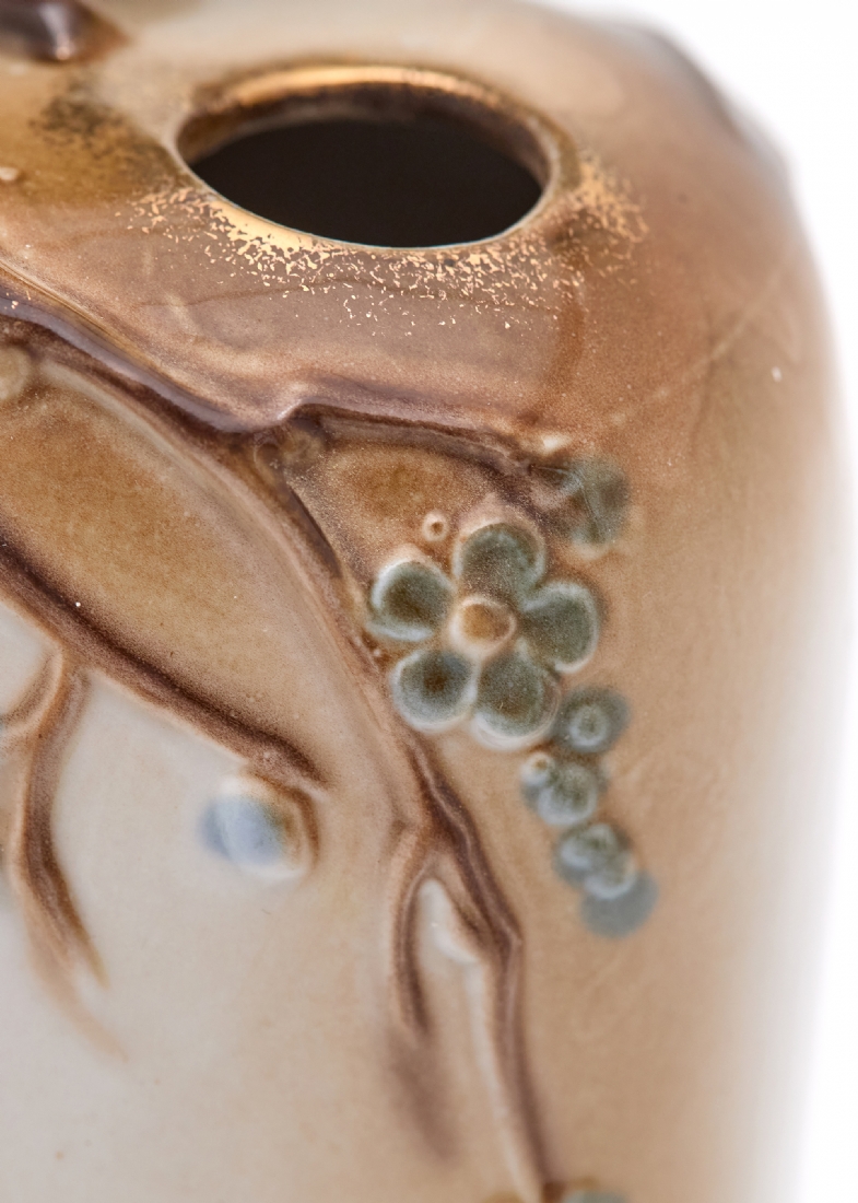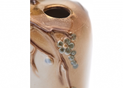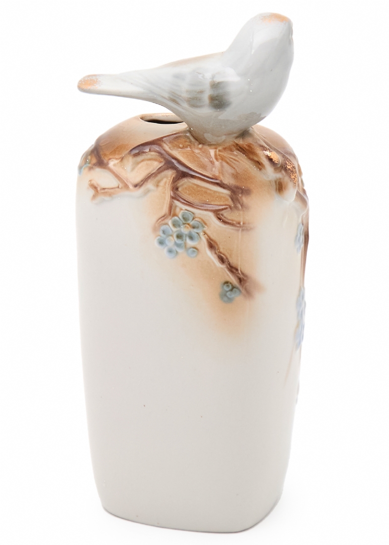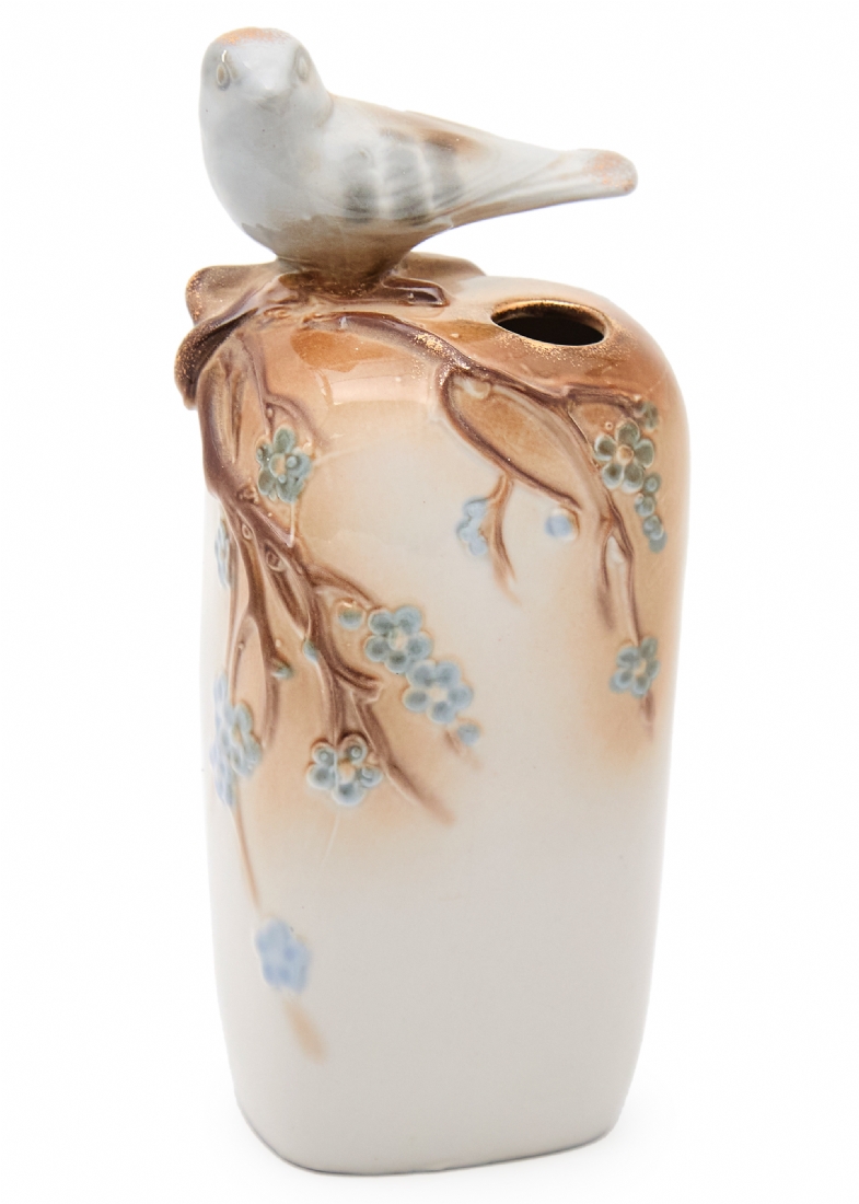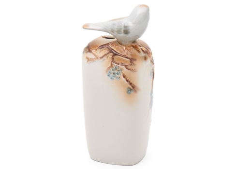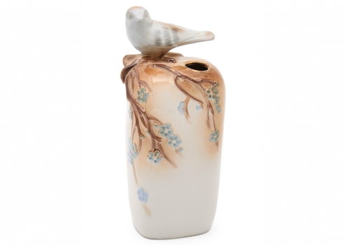 מעוטר בענפי פריחה בגוונים רכים ודמות ציפור תלת־ממדית המשולבת בראש הכלי