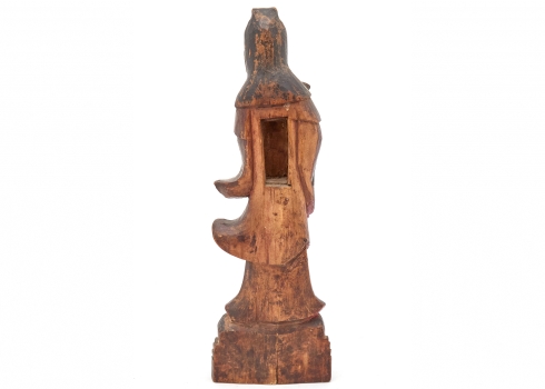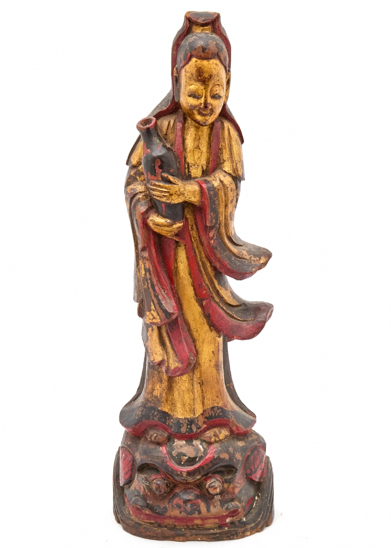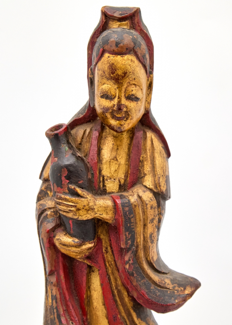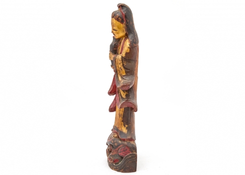 פסל סיני עתיק, עשוי עץ מגולף בעבודת יד, מעוטר באמייל פוליכרום ובזהב