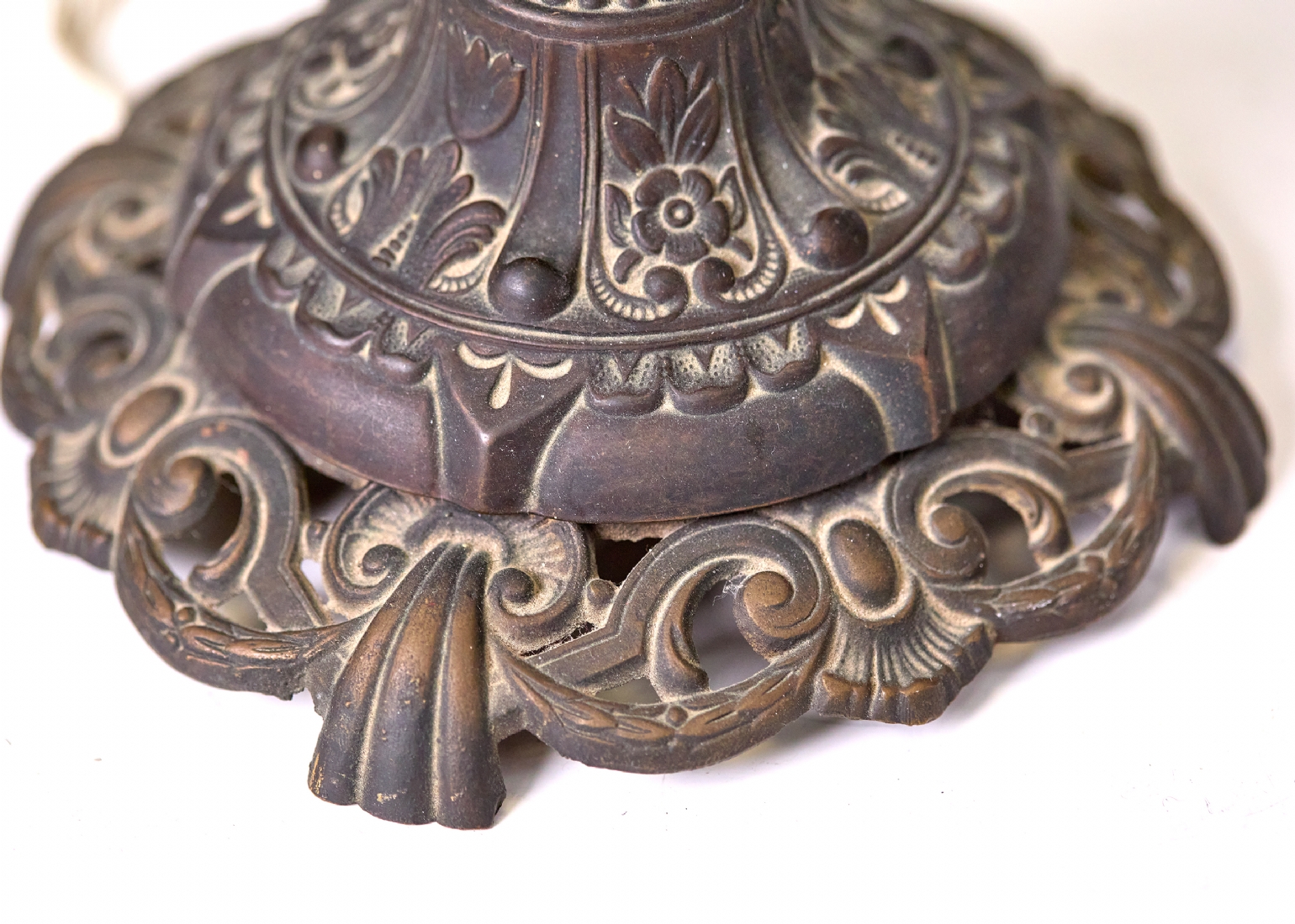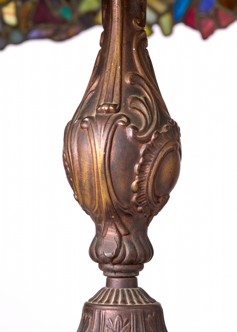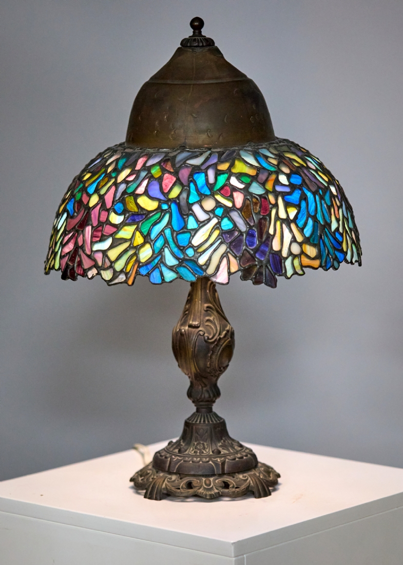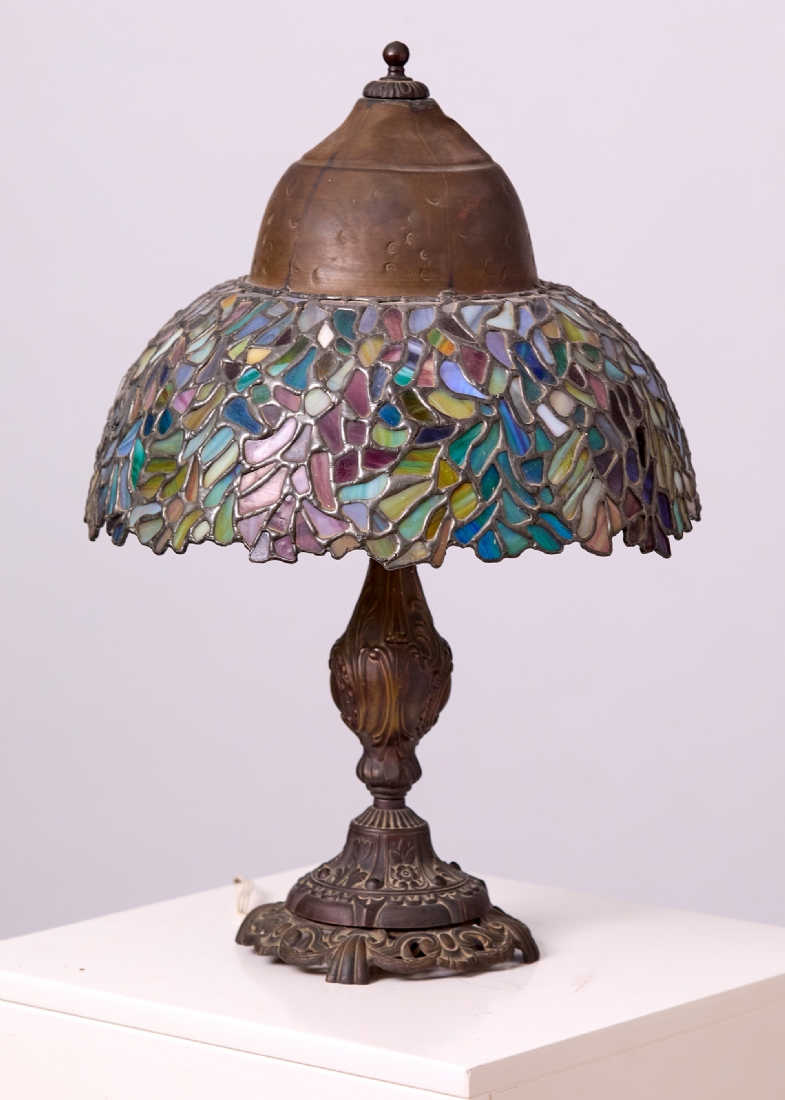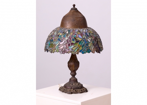 בחלקו העליון של האהיל כיפת נחושת, במצב עבודה תקין (נורה אחת) גובה כולל: 56 ס"מקוטר האהיל: 37 ס"מ