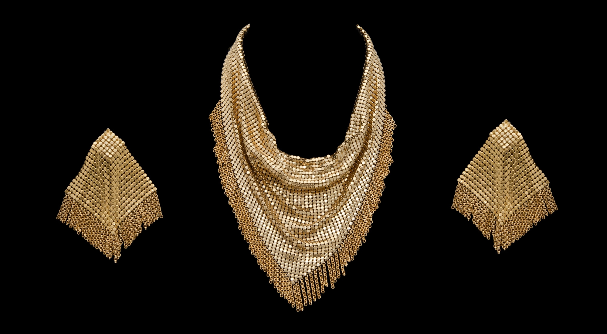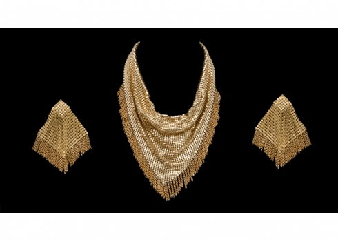 סט תכשיטי אופנה עשויים מתכת בגוון זהב צהוב (ענק וזוג עגילים תואמים).