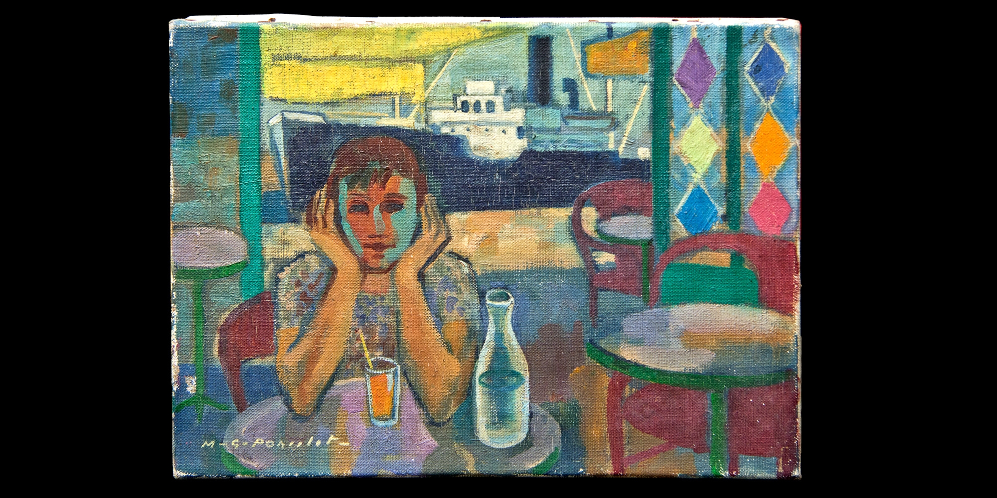 'גבר חושב בבית קפה', שמן על בד, חתום (אמן לא מזוהה), מידות: 24X33 ס"מ.