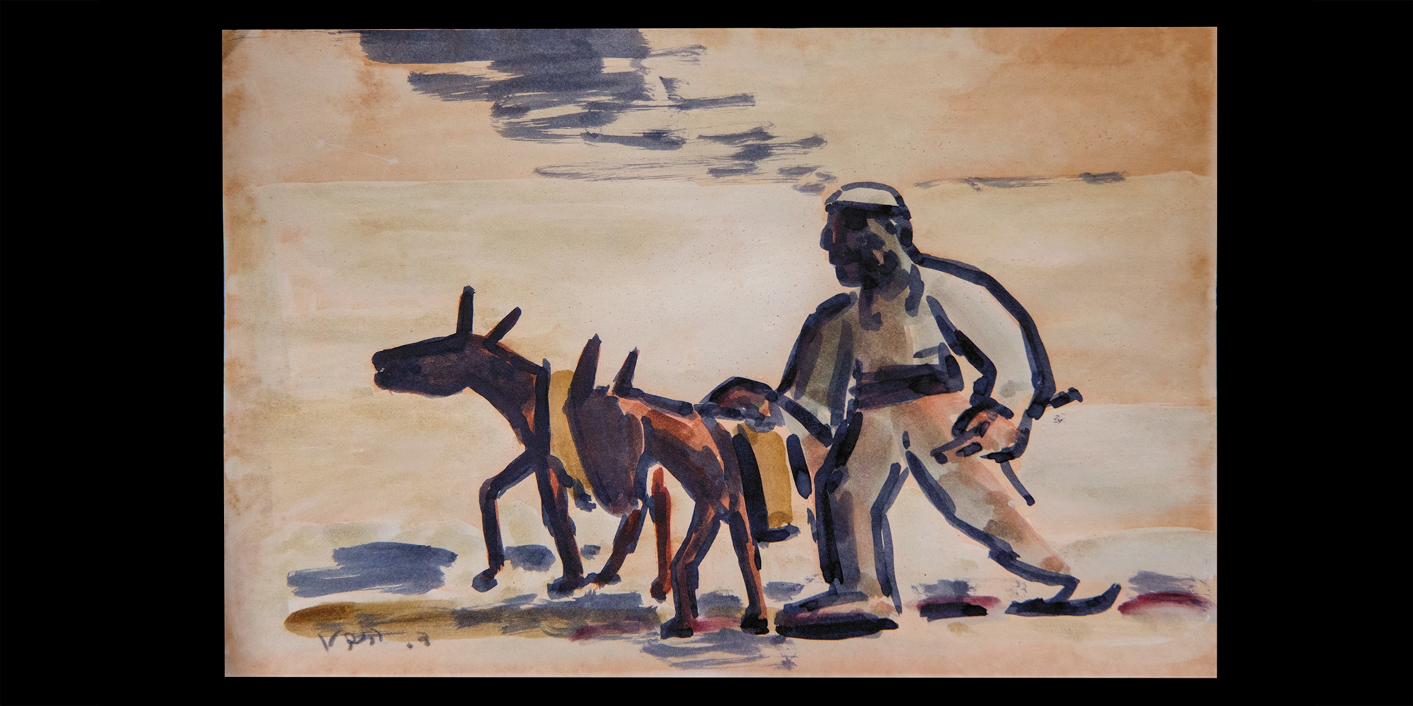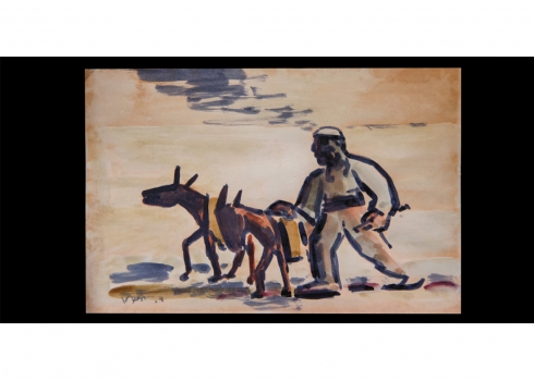 מספר הפריט בקטלוג 328דוד הנדלר - 'אדם עם שני חמורים', אקוורל על נייר, חתום, לא ממוסגר, מידות: 33X48 ס"מ.