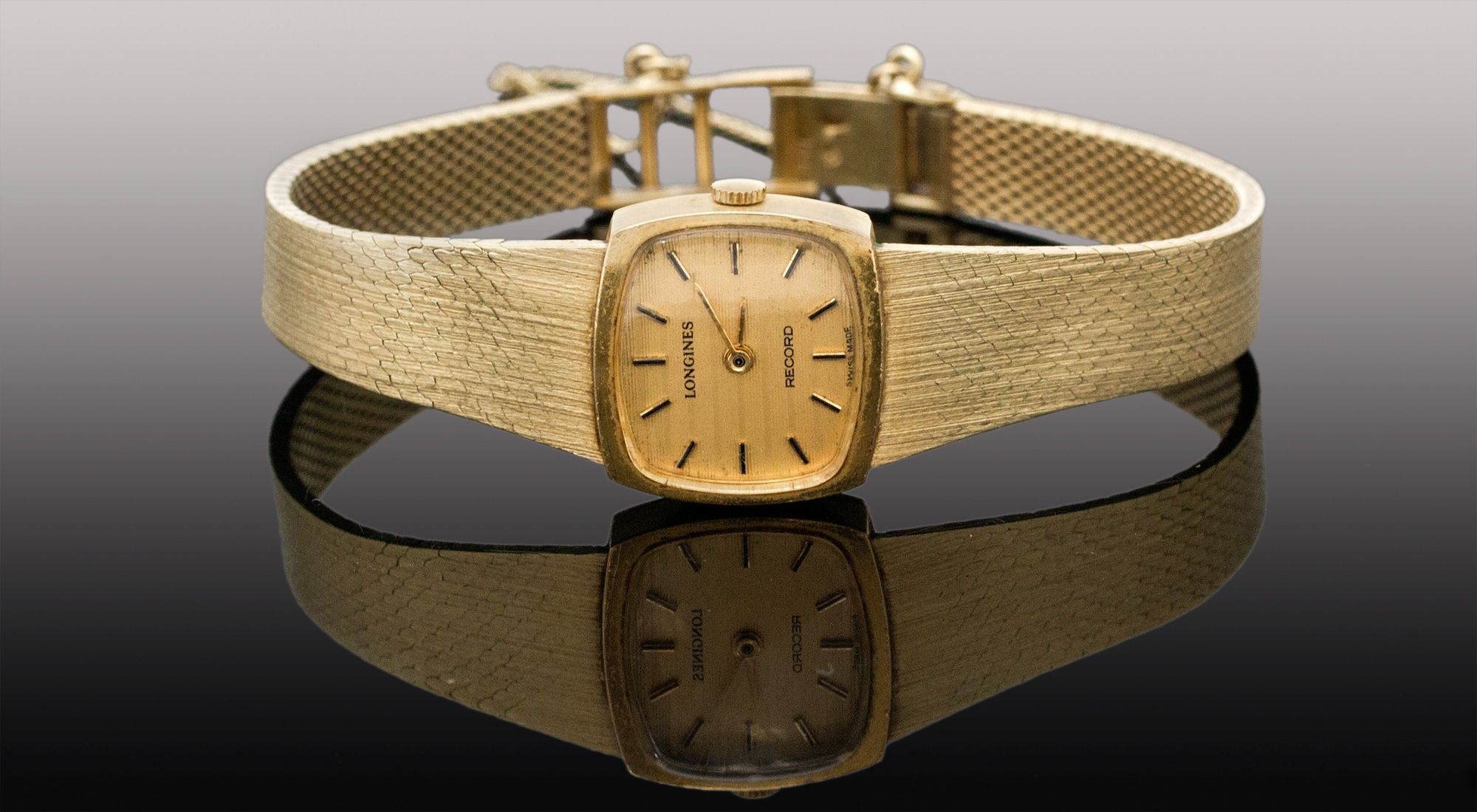 שעון יד לאישה מתוצרת: 'LONGIN', עשוי זהב צהוב 14 קארט (גם הרצועה), סה"כ משקל: 32.65 גרם.